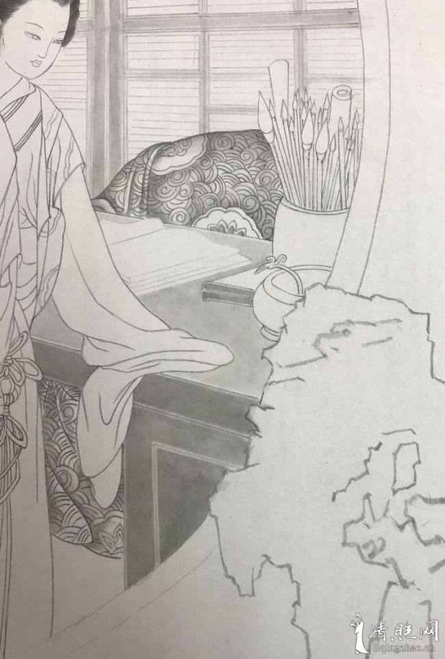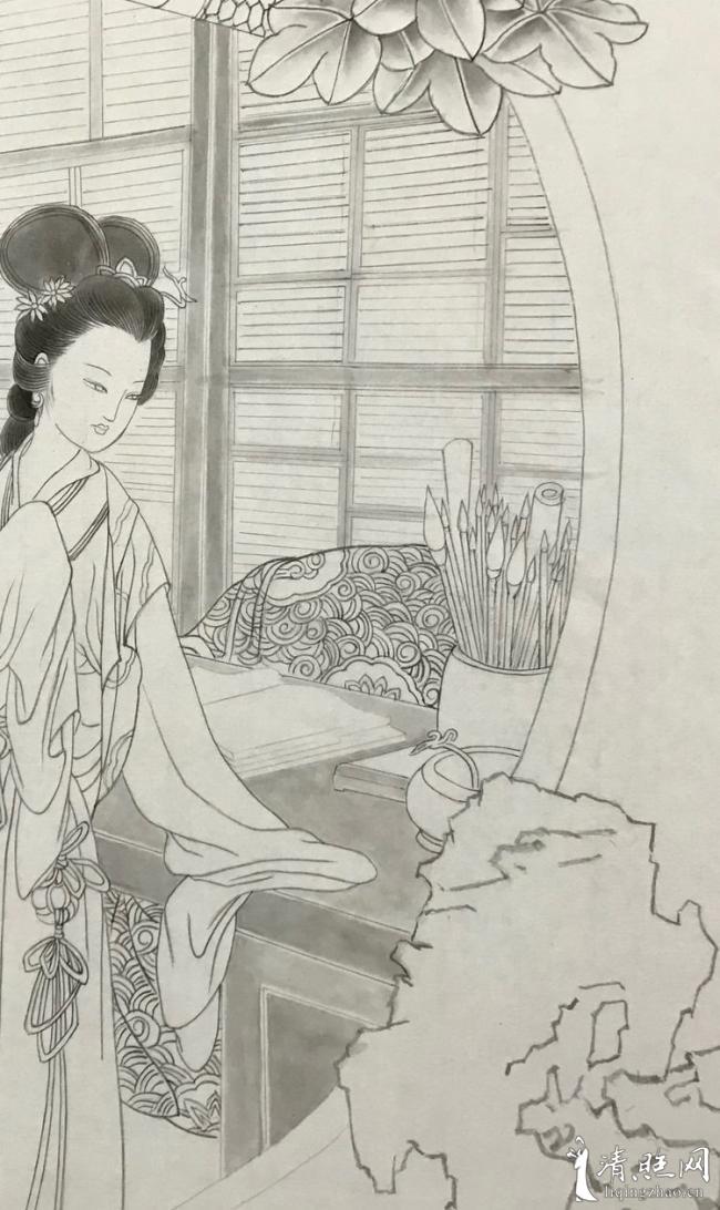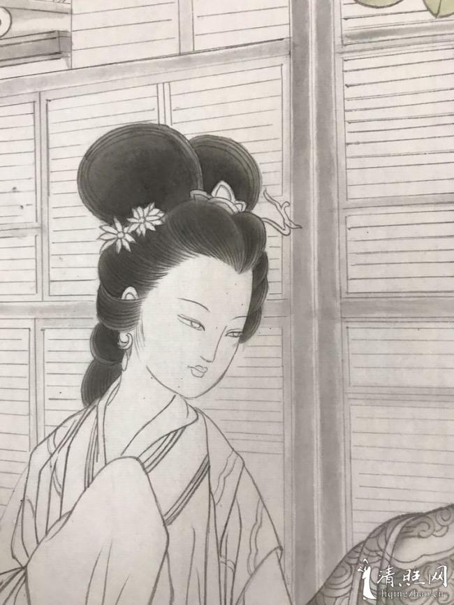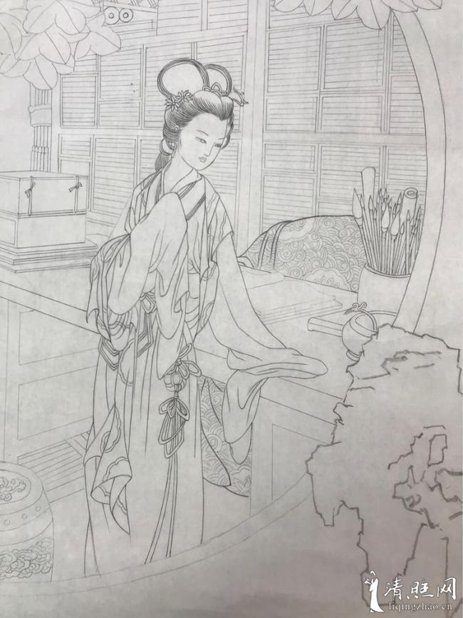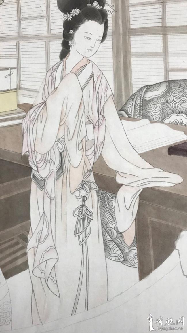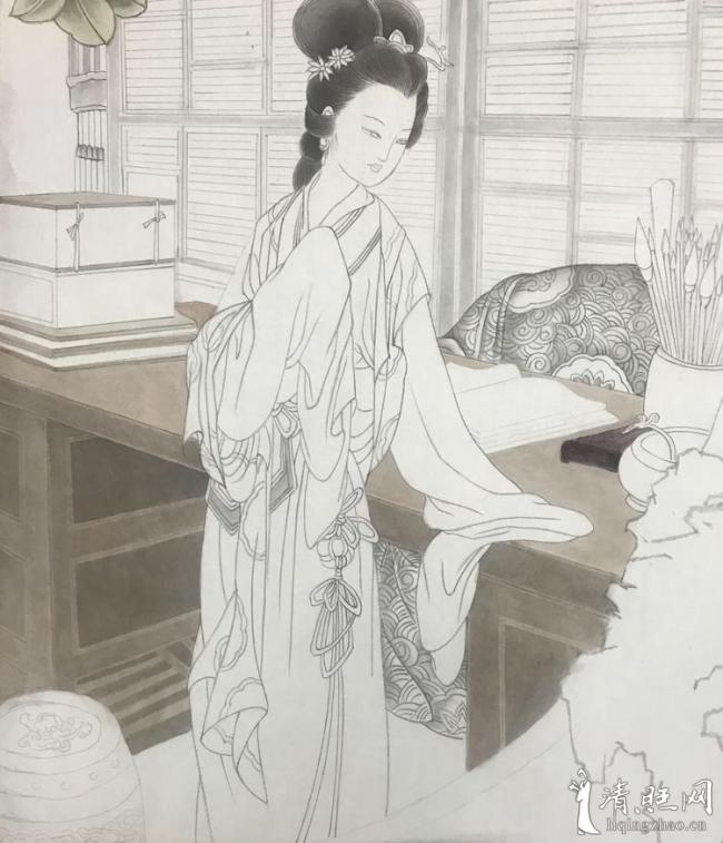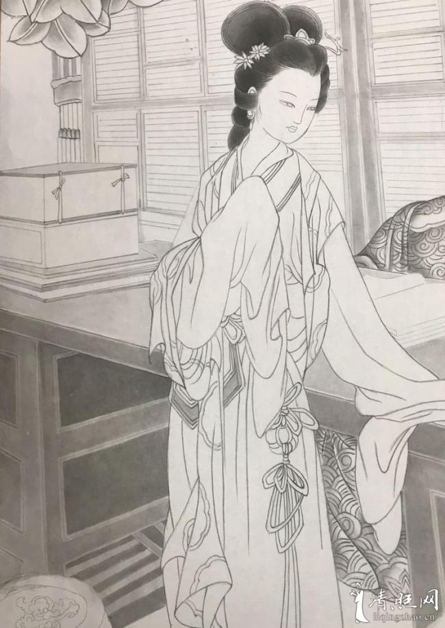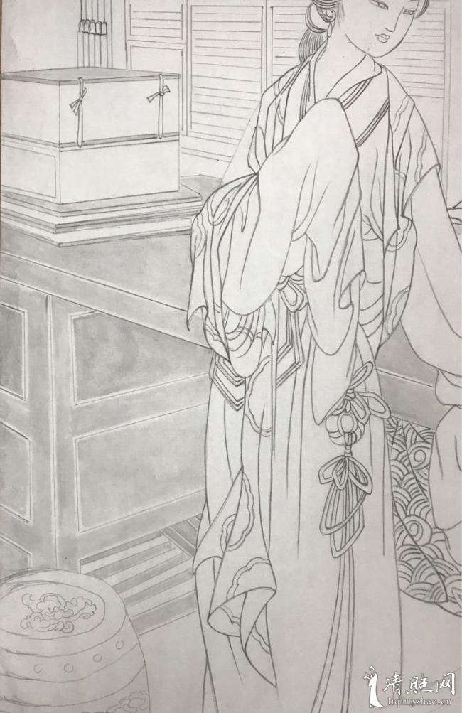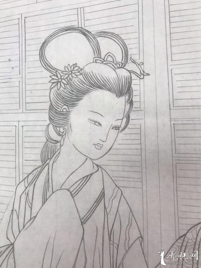 脸部、衣裙、唇部淡墨勾线又细又淡。头饰线不宜太浅。