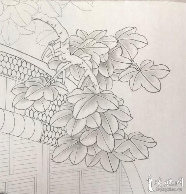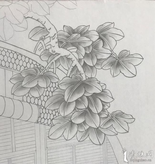 第一遍:同左侧,叶面的叶脉两侧留水线,淡墨分染;
