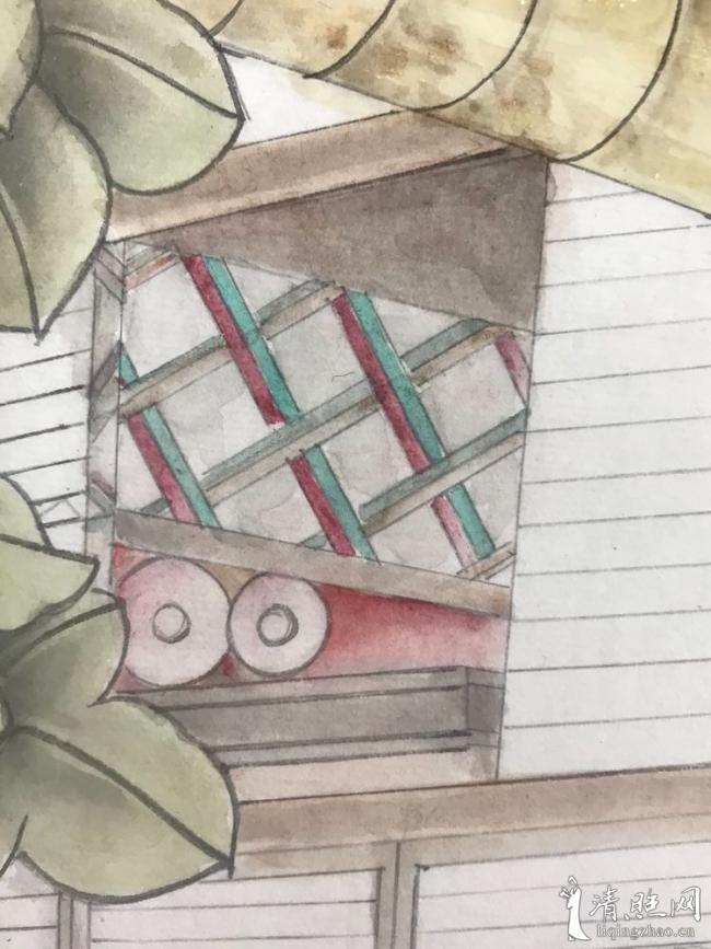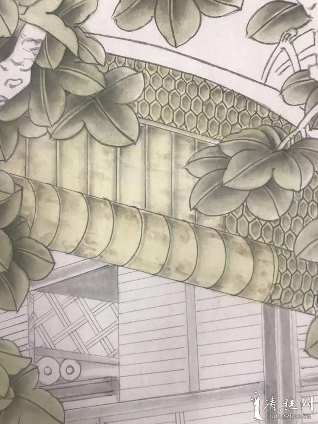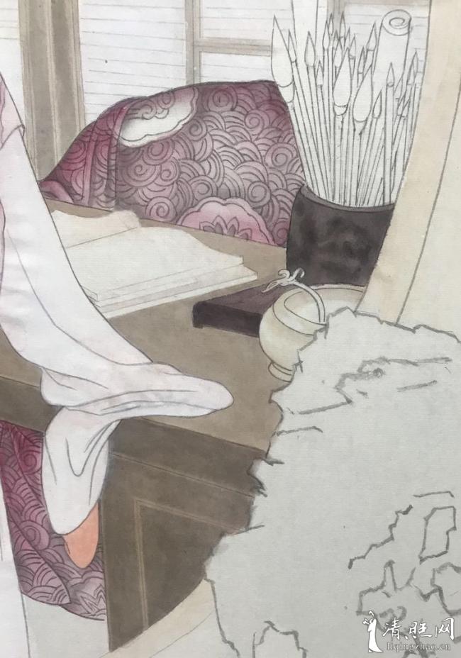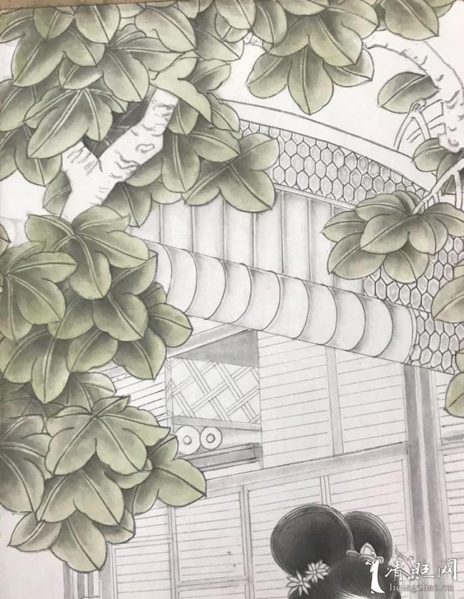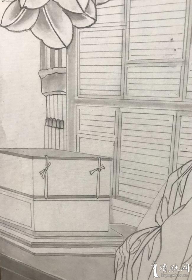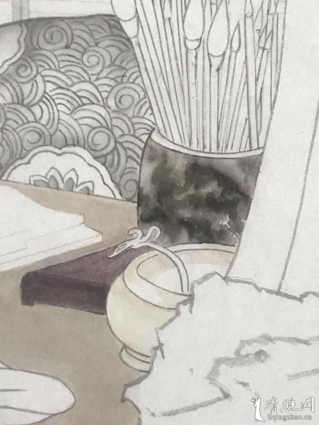 帘的各部分分染勾勒用赭石:花帘分染;垂帘控白线分染;珠帘与垂帘间线的勾勒;卷帘纹点染,尽量把卷帘中间的亮白处留住。