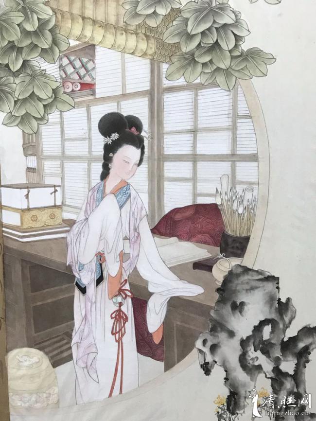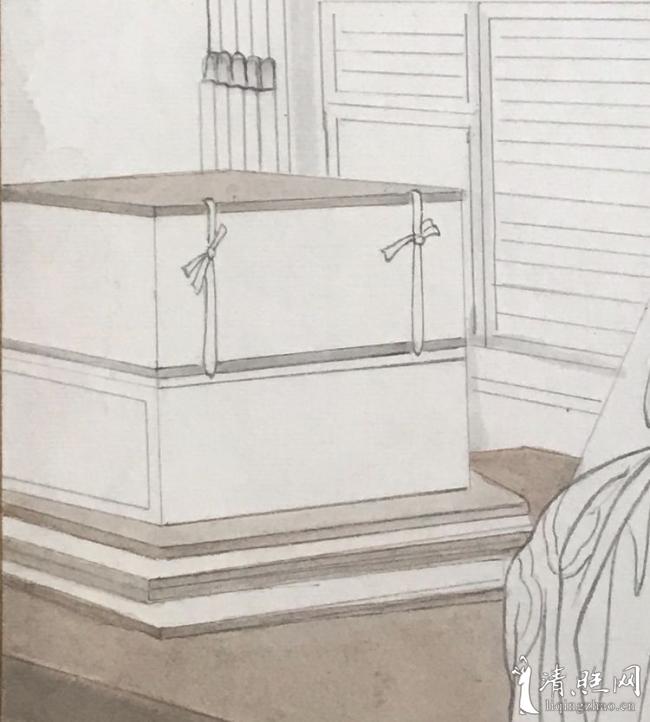 书架。仕女左侧书架线条用界尺淡墨勾勒。