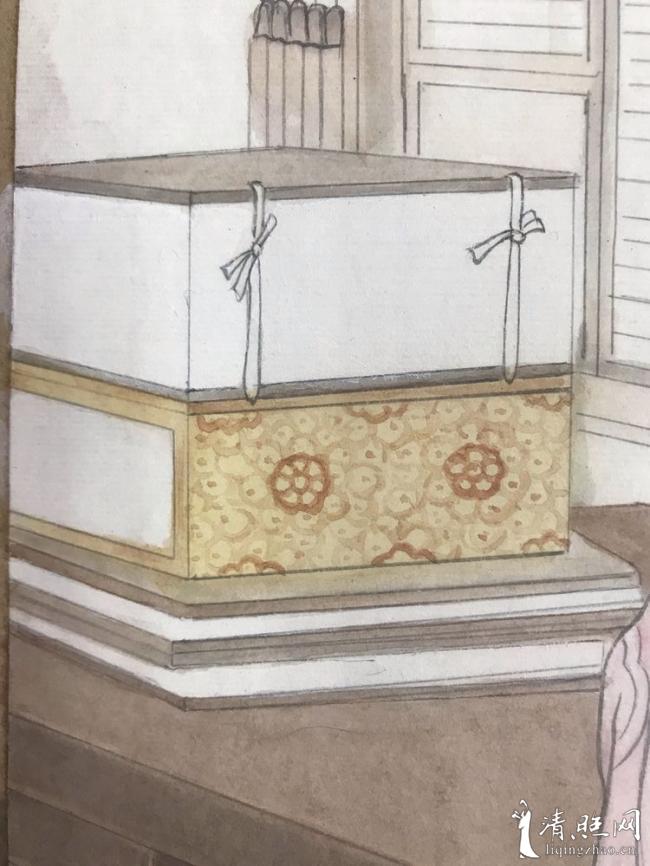 第二个锦盒正面:桌色+一点藤黄,平涂。干后勾染花纹和底纹。