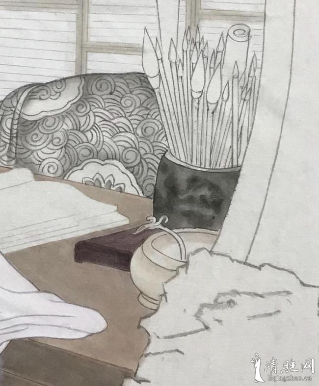 1、棱条:赭石+一点点花青、白粉,平涂。较之桌色不宜深,方显位于桌后。左侧书架色较右侧浅,画面即有距远之感。