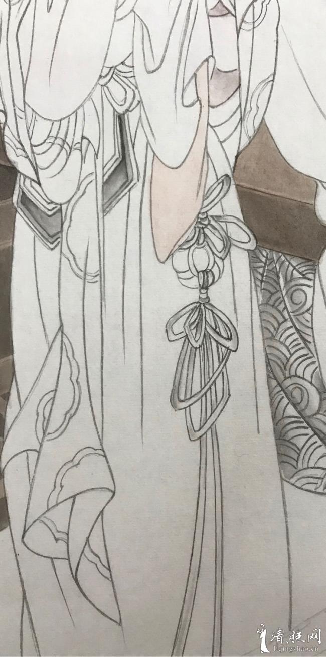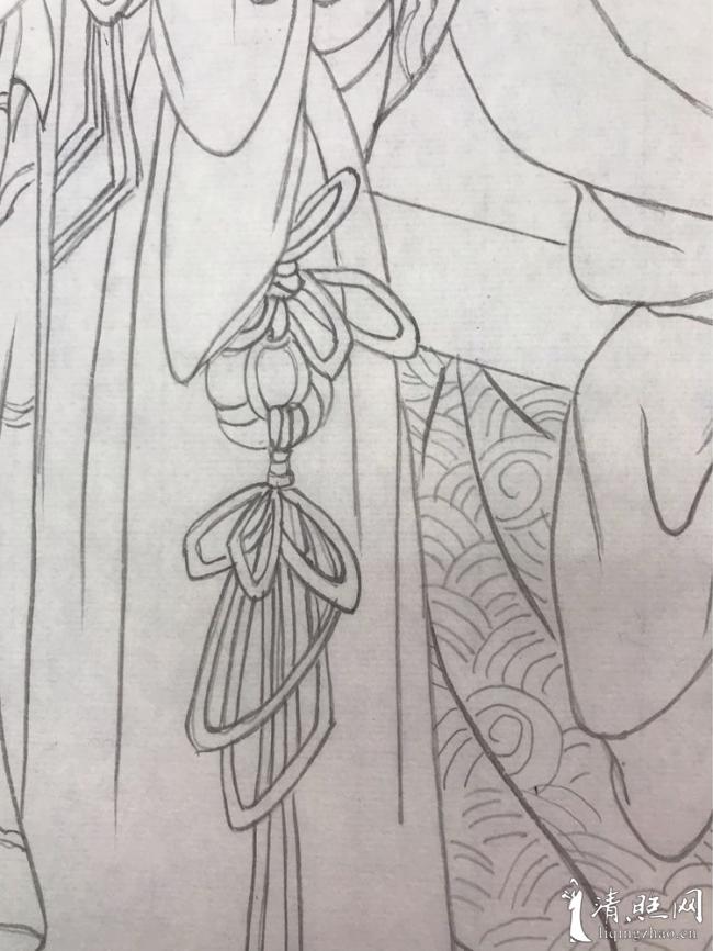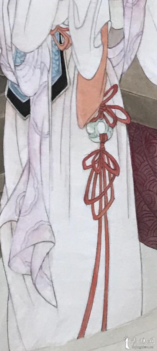 玉佩墨线稍淡,下面带结稍色重,往下的带子勾时需提笔。