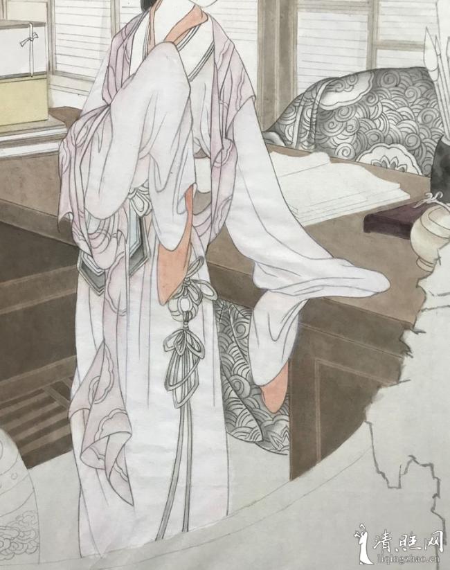 1)桌侧的阴面板再次平涂一遍。注意把仕女服装与之交接的桌边染得干净清晰,才使人物突于画前。