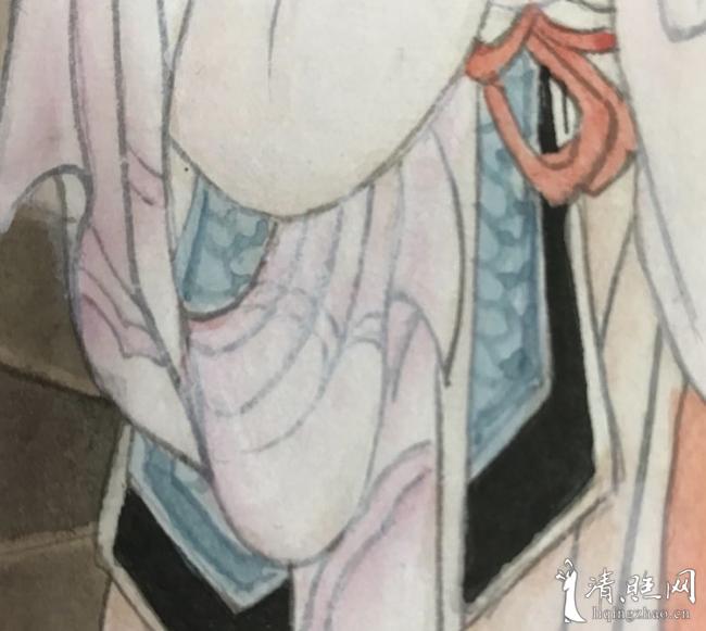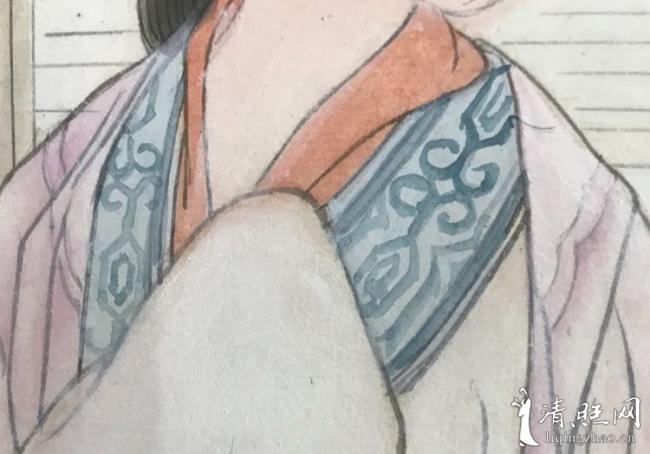 衣领边、小巾儿内:花青+一点白粉(稍深于底色),勾染衣领两侧条纹并勾花纹、勾小巾子花纹。