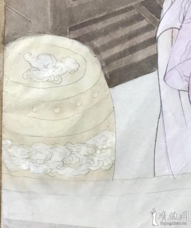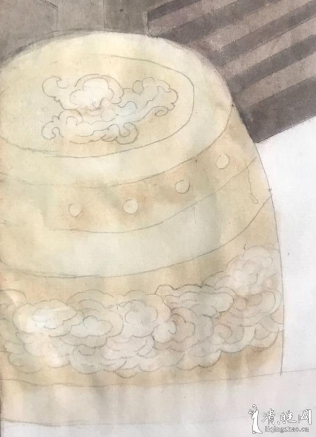 绣墩。淡赭石(若太火可加一点花青)平涂除云头纹的部分。干后,白粉+藤黄+赭石,薄薄平涂绣墩,湿润时对云头纹撞一点白粉。