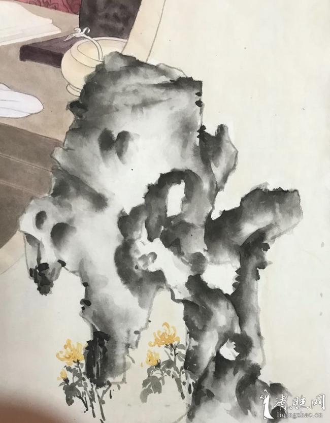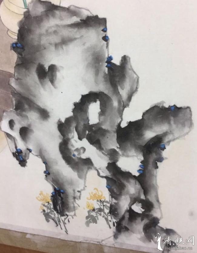 假山。淡中墨分染,先勾染出假山的大致形态,注意前后关系和深浅明暗,凸显石头的瘦、漏、透性味。石底边菊花,藤黄+赭石 。叶,墨绿色。