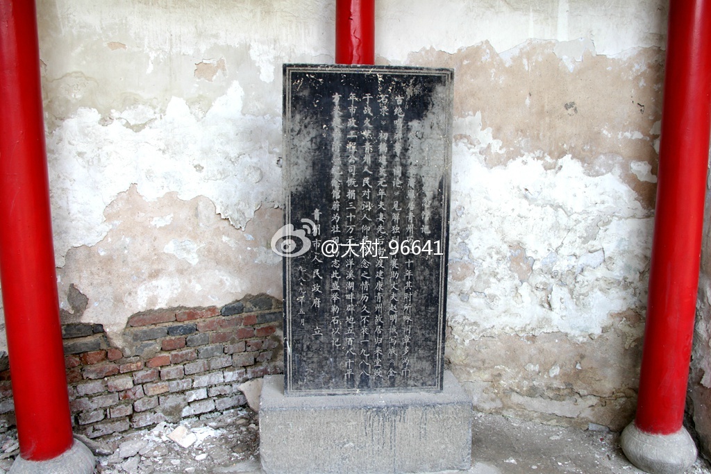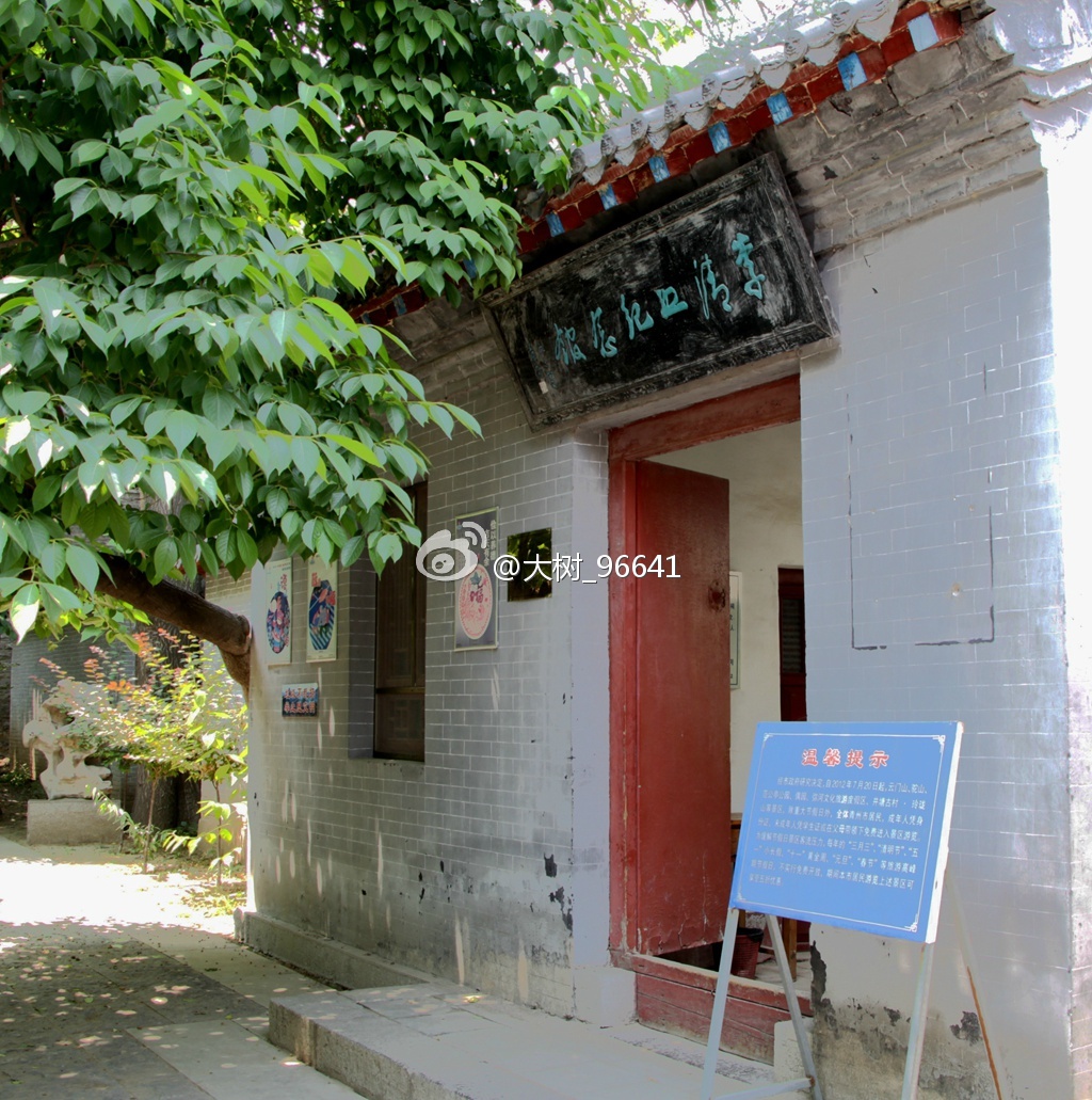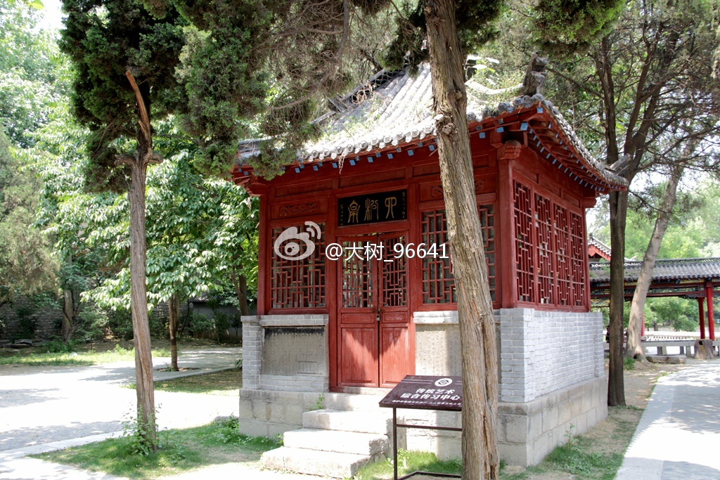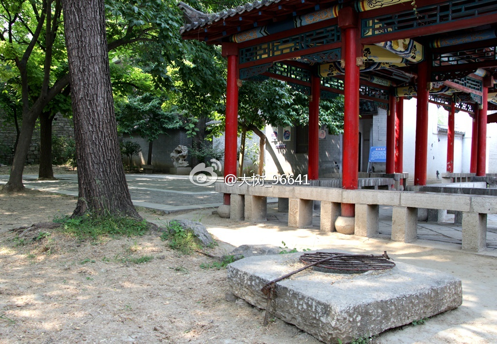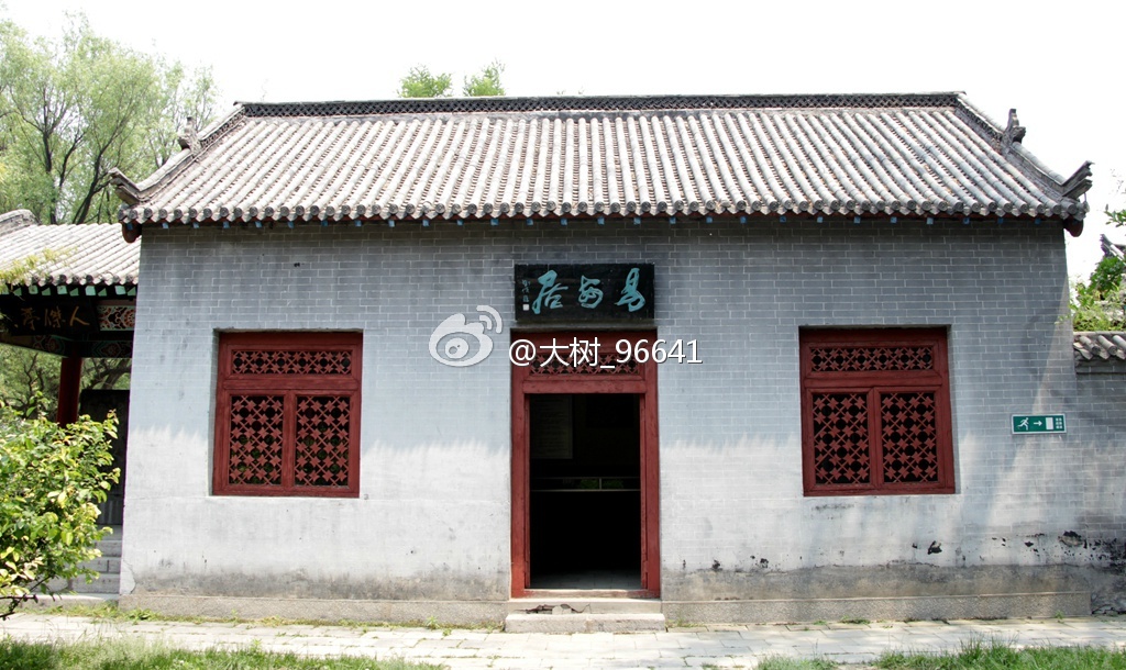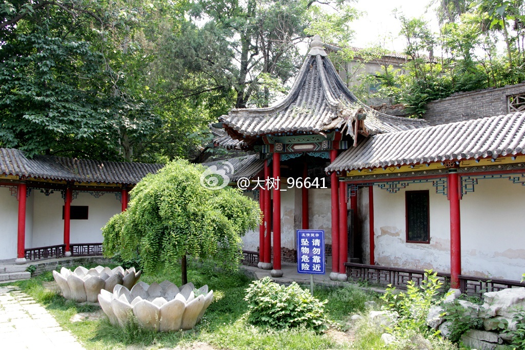 大门面南,正门上是著名诗人臧克家(山东省潍坊诸城县人)题写的匾额。或是中午的缘故,游人稀少,只有门口一位卖冷饮的老大爷。进入大院,苍松翠柏,绿树成荫,远远看到亭廊上有几个人在休息。